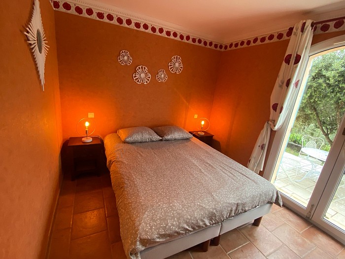 Chambre avec un lit de 160cm , coffre de rangement, télévision écran plat, climatiseur La douche est attenante avec un wc et sèche cheveux. Accès sur la terrasse, verrouillable.